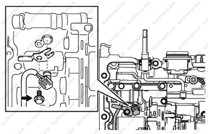 3. Выкрутить болты крепления и отсоединить фиксаторы, после чего извлечь датчик температуры трансмиссионного масла из корпуса главного масляного клапана.