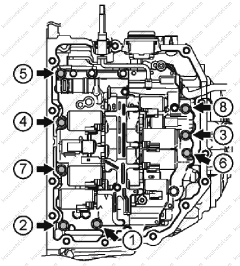 2. Установить и затянуть от руки восемь болтов крепления главного распределителя, как показано на изображении ниже.