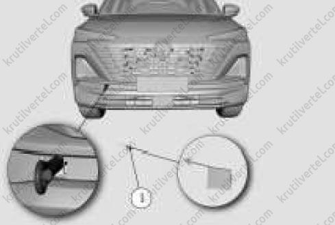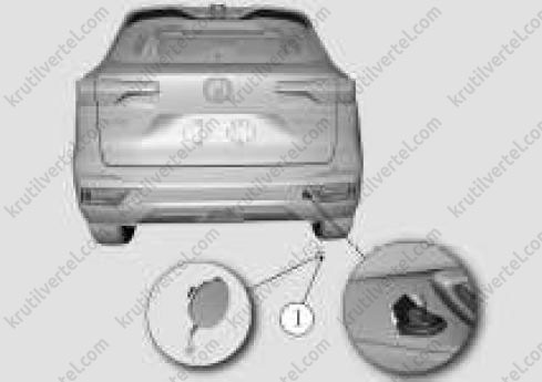 Точка крепления задней буксировочной петли расположена на кузове в правой нижней части заднего бампера автомобиля. Откройте крышку точки крепления (1) для установки буксировочной петли на заднем бампере, установите и затяните буксировочную петлю для использования.