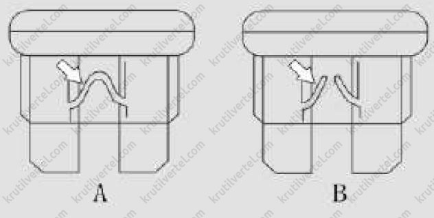 A: Нормальный предохранитель. B: Перегоревший предохранитель.
