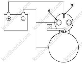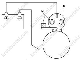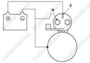 При поступлении питания тяговое реле стартера замыкается, образуя замкнутую цепь между аккумуляторной батареей и стартерным электродвигателем. Стартер соединяется с «массой» через блок цилиндров двигателя. При выполнении двух вышеуказанных условий по питанию и соединению с «массой» стартер начинает работать и запускает двигатель.