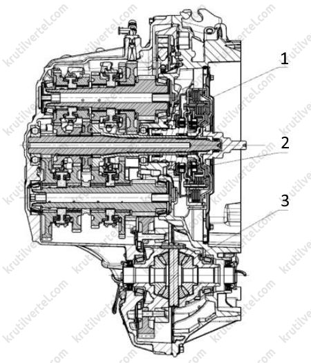 Коробка передач DCT имеет два вала, и полый вал располагается снаружи цельного вала. Каждое из сцеплений управляет включением передач на одном валу.