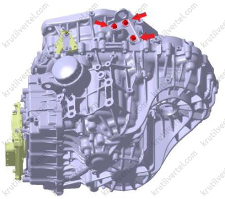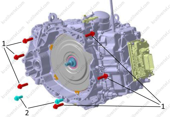 2. Отверните восемь болтов крепления, соединяющие двигатель и коробку передач.