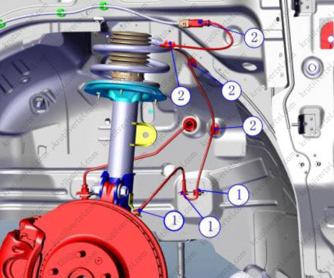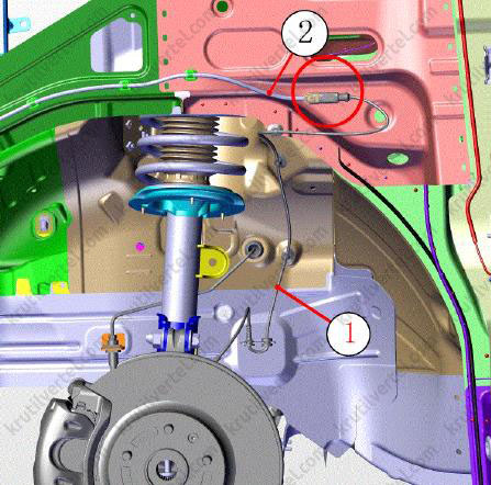 1. Датчик скорости переднего колеса. 2. Жгут проводов питания. «Круг» - Точка подключения.