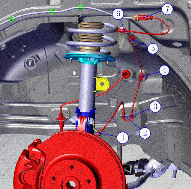 2. Соберите зажимы жгута проводов на кузове автомобиля и кронштейне в следующем порядке: (1) → (2) → (3) → (4) → (5) → (6) → (7). Во время сборки обратите внимание на то, чтобы жгут проводов датчика скорости колеса был без натяжения и не перекручивался.