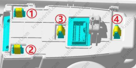 2. После снятия центральной панели управления используйте плоскогубцы, чтобы сжать четыре крепежных зажима, как показано на рисунке, и затем снимите выключатель электрического стояночного тормоза.