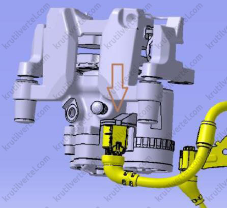 Электродвигатели управления стояночным тормозом устанавливаются по отдельности на тормозных суппортах левого и правого задних колес, и эти электродвигатели разделяются на две части: электродвигатель постоянного тока и редуктор. Электродвигатель управления стояночным тормозом встроен в тормозной суппорт заднего колеса, и таким образом, если возникает неисправность какого-либо компонента, суппорт вместе с управляющим электродвигателем EPB подлежит замене, причем электродвигатель EPB невозможно заменить отдельно. Управляющий электродвигатель работает во время работы стояночного тормоза. В управляющем электродвигателе отсутствует соответствующий датчик для обнаружения зажимного усилия тормозных колодок. Вместо этого зажимное усилие тормозных колодок оценивается по изменению тока электродвигателя, вызываемому изменением нагрузки при активации тормозных колодок. При этом рабочее состояние электродвигателя постоянного тока контролируется блоком управления EPB.