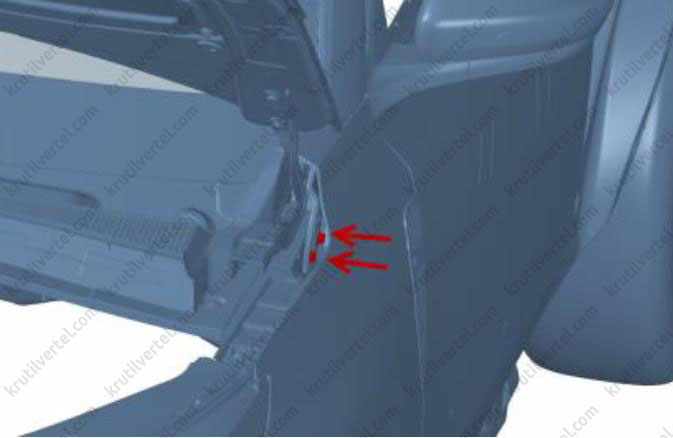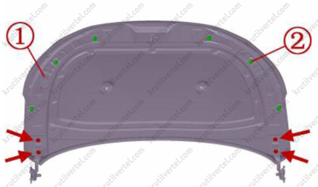 2. Отверните два болта крепления (стрелки) соответственно справа и слева петли капота двигателя к капоту.