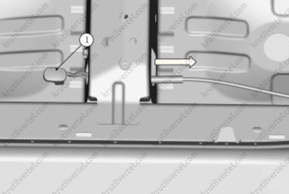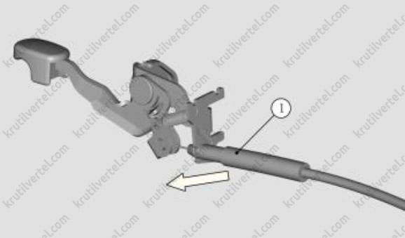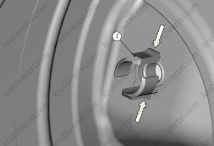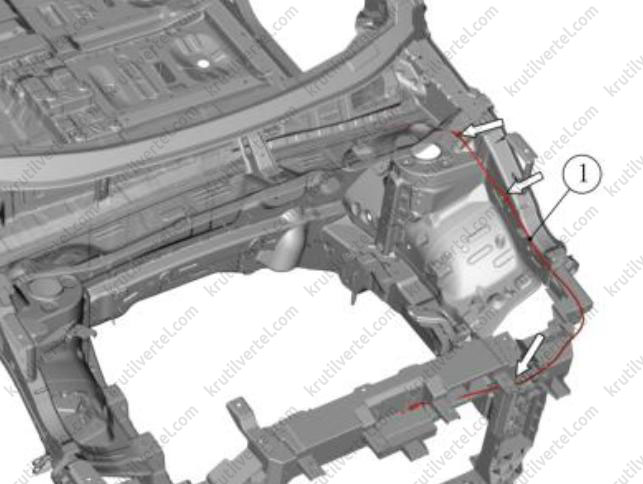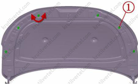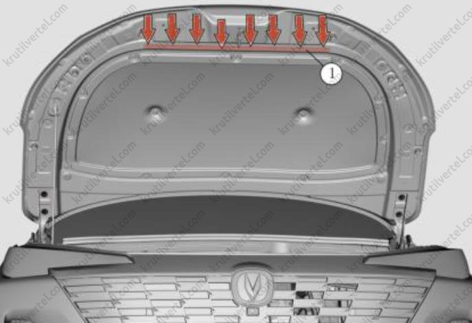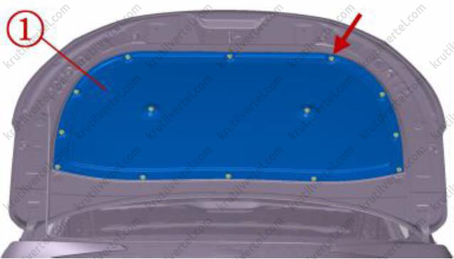 1. Ослабьте (но не отворачивайте полностью) болты крепления петель капота двигателя (со стороны капота) (стрелки), чтобы отрегулировать положение капота (1) относительно других кузовных панелей.