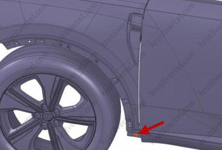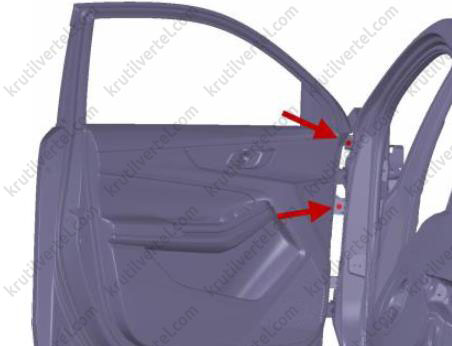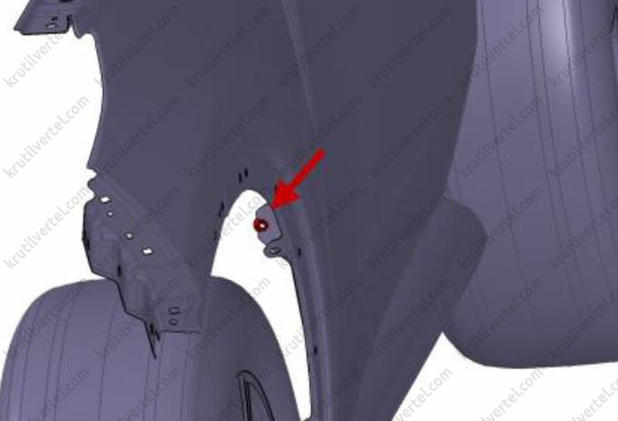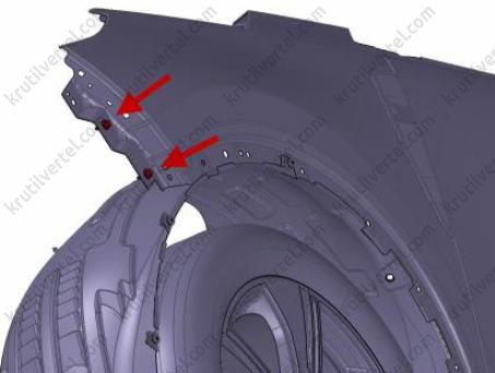 2. Откройте переднюю левую дверь и отверните два болта крепления (стрелки) в задней части крыла.