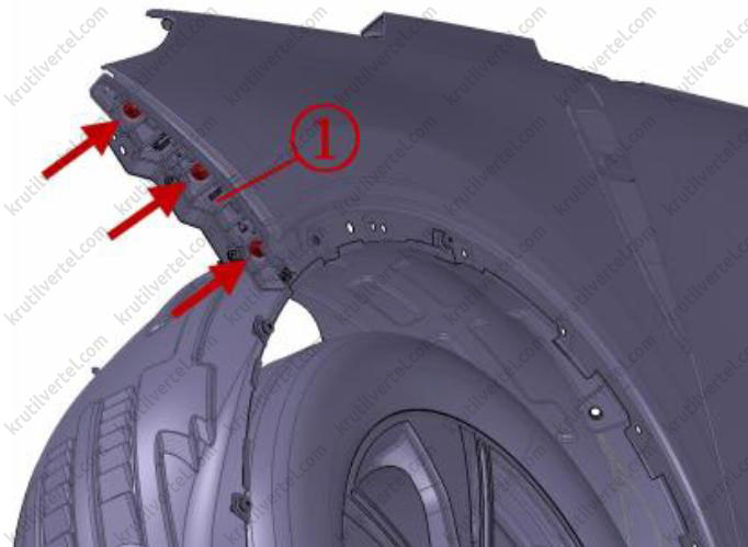 5. Снимите зажим подкрылка передней колесной арки (стрелка) и отсоедините подкрылок (1), чтобы получить доступ к внутренней гайке крепления крыла.
