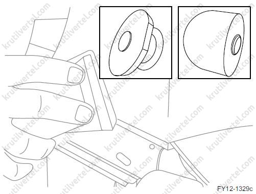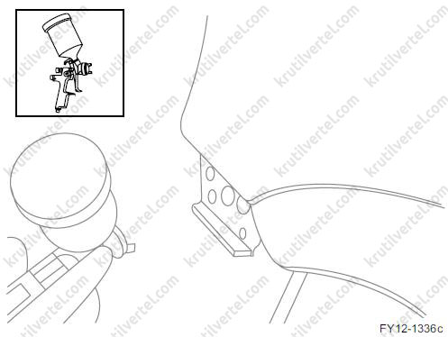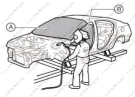 1. При нанесении материала звукоизолирующего или антикоррозионного покрытия распылением примите необходимые меры для предотвращения распыления внутрь открытых компонентов (таких как дверные замки, желоб стеклоподъемника, механизм стеклоподъемника и т.д.), на любые движущиеся и вращающиеся детали, особенно на трос стояночного тормоза. После распыления материалов убедитесь в том, что все дренажные отверстия кузова открыты.