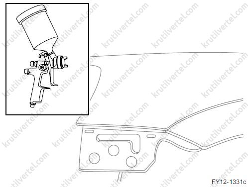 10. После испарения в течение 2 – 3 минут распылите второй слой базовой краски, пока не перестанет быть очевидным место перехода. Давление воздуха составляет 150 – 200 кПа. После испарения в течение 2 – 3 минут распылите второй слой базовой краски, пока не перестанет быть очевидным место перехода. Давление воздуха составляет 150–200 кПа. Расстояние от сопла пульверизатора до поверхности 20 – 30 см.