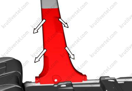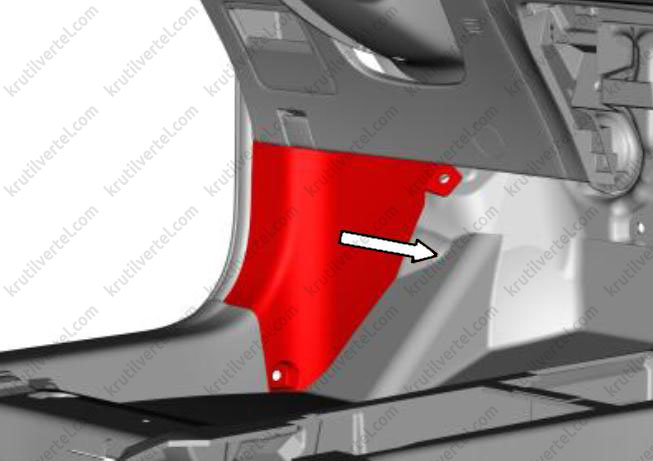 1. С помощью крестовой отвертки отверните задний саморез с крестообразной головкой и плоской шайбой (стрелка) декоративной накладки порога задней двери.