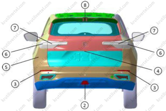 2. Задний противотуманный фонарь в сборе. 3. Рефлектор-отражатель в сборе. 4. Фонарь подсветки номерного знака. 5. Лампа освещения багажного отделения. 6. Задний комбинированный фонарь сборе I. 7. Задний комбинированный фонарь сборе II. 8. Высокорасположенный стоп-сигнал.