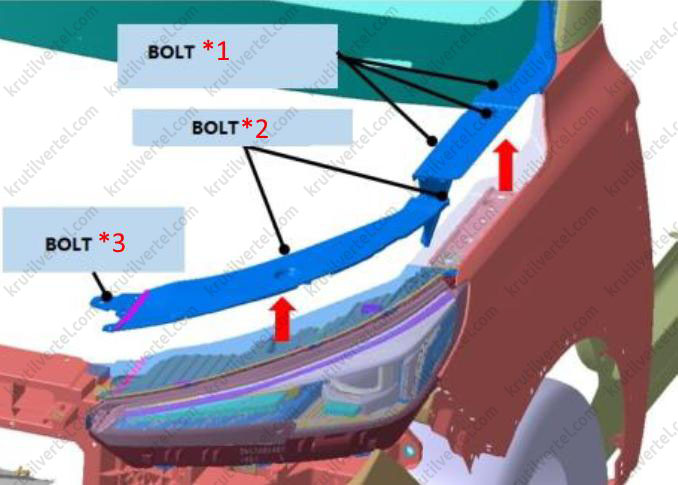 2. С помощью крестовой отвертки и головки на 10 отверните винты и болт крепления верхних накладок. После чего снимите верхнюю накладку крыла и верхнюю накладку передней блок-фары.
