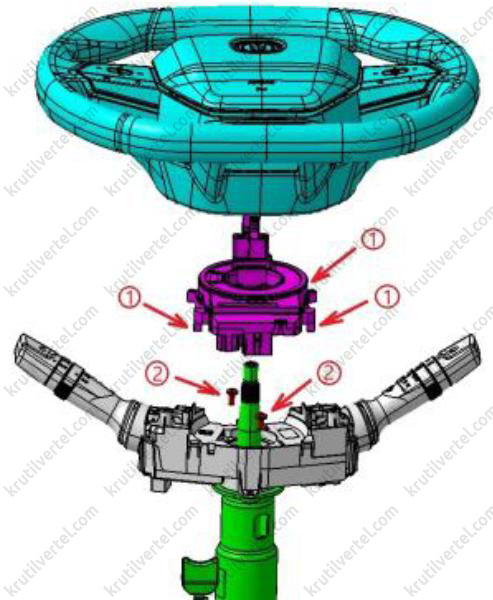 4. После снятия рулевого колеса, вручную, без каких-либо инструментов, расцепите три стопорных язычка (стрелки 1) и затем снимите спиральный кабель.
