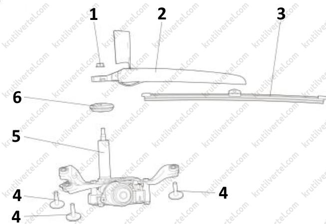 - Узел рычага заднего стеклоочистителя.