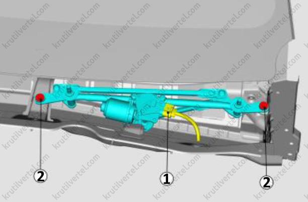 - Узел электродвигателя стеклоочистителя и приводной тяги.