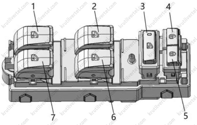 Кнопки управления стеклоподъемниками расположены на каждой двери. На двери водителя расположен центральный блок управления всеми окнами, с возможностью их блокировки. Кнопка (3) — это кнопка блокировки стеклоподъемников. Нажатие кнопки блокировки может заблокировать и разблокировать стеклоподъемники на остальных трех дверях, кроме двери водителя. Кнопка (4) — это выключатель блокировки двери. Когда дверь находится в закрытом состоянии, нажмите правый конец кнопки, чтобы заблокировать дверь, и нажмите левый конец кнопки, чтобы разблокировать дверь.