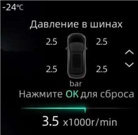 - Индикатор постоянно горит желтым: предупреждает о низком давлении в шинах. Информация о давлении в шинах отображается совместно с текстовой подсказкой на многофункциональном дисплее. Для обеспечения безопасности, прежде чем продолжить движение, проверьте давление в шинах и убедитесь, что оно соответствует рекомендованному. При необходимости и возможности безопасного передвижения - обратитесь на ближайшую станцию технического обслуживания для проверки и регулировки давления в шинах. После проверки и установки рекомендованного значения давления в шинах продолжайте движение.