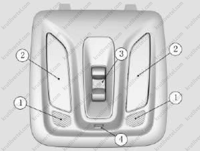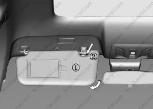 1. Косметическое зеркало в солнцезащитном козырьке. 2. Кронштейн крепления солнцезащитного козырька.