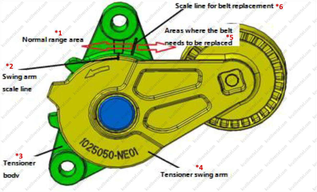- Проверьте, выходит ли метка на качающемся рычаге граничную метку на корпусе натяжителя.