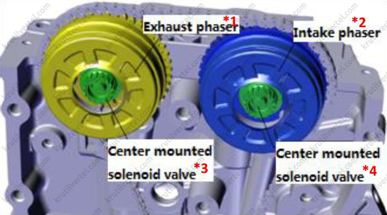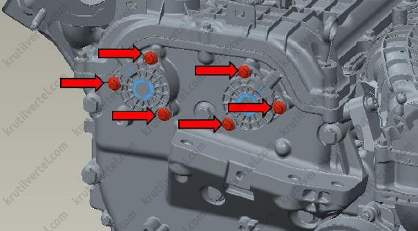 3. С помощью головки на 8 отверните шесть болтов крепления и затем снимите два управляющих электромагнита системы изменения фаз газораспределения.