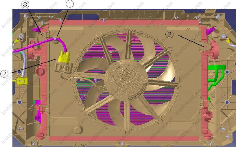 4. С помощью головки на 10 отверните левый и правый болты крепления (3), соединяющие вентилятор системы охлаждения и радиатор.