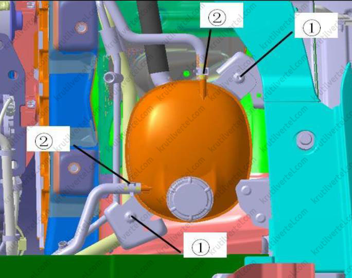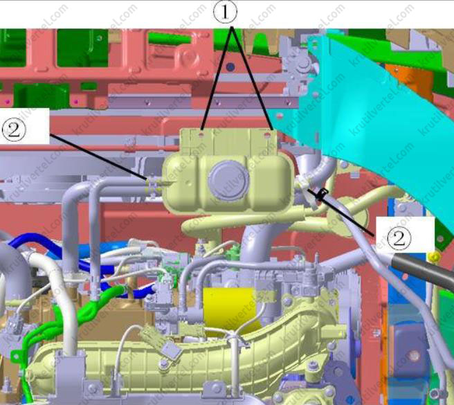 5. Ослабив хомуты крепления (2), отсоедините шланги/трубки охлаждающей жидкости от высокотемпературного расширительного бачка.