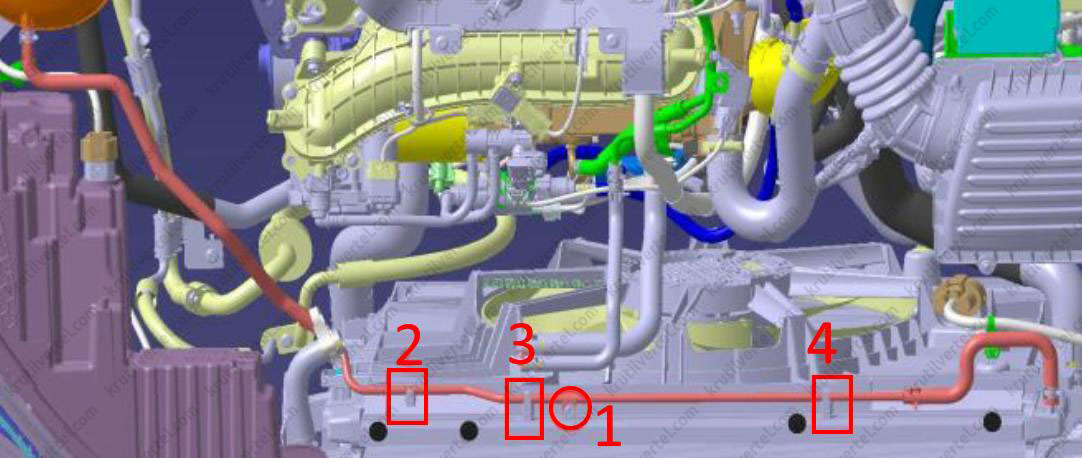 1. С помощью отвертки Torx отверните винт крепления (1), соединяющий пароотводную трубку радиатора с верхней поперечиной рамы радиатора. После этого осторожно извлеките пароотводную трубку радиатора из креплений (2, 3 и 4), показанных на рисунке ниже.