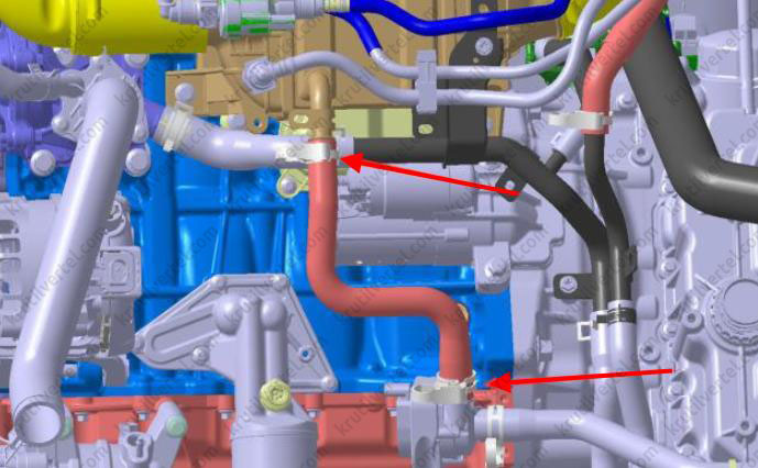 2. Отсоедините подводящий шланг высокотемпературного радиатора от патрубка двигателя и патрубка высокотемпературного радиатора и затем снимите.