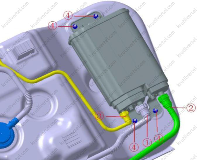 2. Отсоедините трубки (1, 2 и 3) от угольного адсорбера.