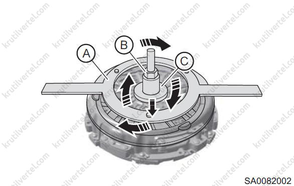 - Не прикладывайте момент более 5 кН при снятии. Если этого не сделать, будет поврежден подшипник сцепления.