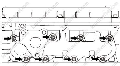 3. Затянуть 8 новых гаек крепления выпускного коллектора в последовательности от центра крест-накрест. Момент затяжки: 28±2 Н∙м.