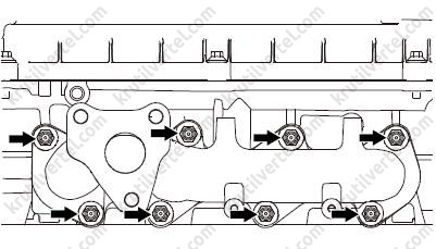 4. Отвернуть восемь гаек крепления выпускного коллектора, снять 8 гаек крепления выпускного коллектора и 8 плоских шайб, как показано на изображении ниже.