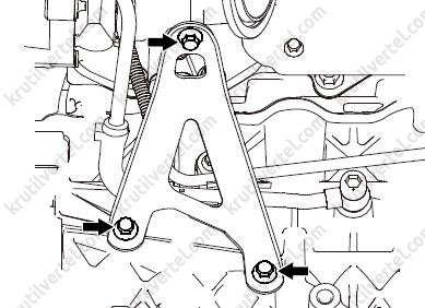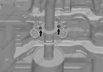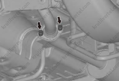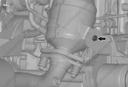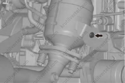 9. Выкрутить болт крепления кронштейна переднего каталитического нейтрализатора, как показано на изображении ниже.