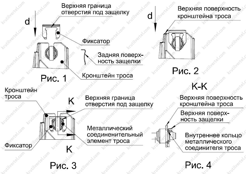 Этап 2: с помощью подходящего инструмента установить фиксатор вниз по направлению стрелки d, как показано на рис.2; когда верхняя граница отверстия фиксатора контактирует с внутренним кольцом металлического соединения троса, верхняя поверхность фиксатора параллельна верхней поверхности кронштейна троса, а также находится ниже верхней поверхности кронштейна троса на 7 мм и более, фиксатор установлен на место. Состояние после завершения установки показано на рис. 3, 4.