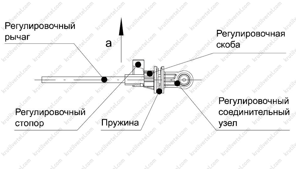 Регулировочная скоба под действием пружины фиксирует регулировочный стопор; регулировочный стопор переводится в крайнее положение в направлении, указанном стрелкой а; регулировочный соединитьльный узел может перемещаться относительно осевого направления регулировочного рычага.