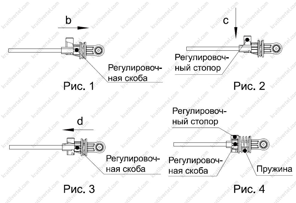 Удерживая регулировочный стопор в крайнем положении, переместите регулировочную скобу до упора в направлении, указанном стрелкой d; состояние после завершения показано на рис. 4. В это время под действием пружины, регулировочный стопор блокируется регулировочной скобой.