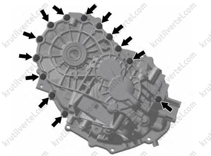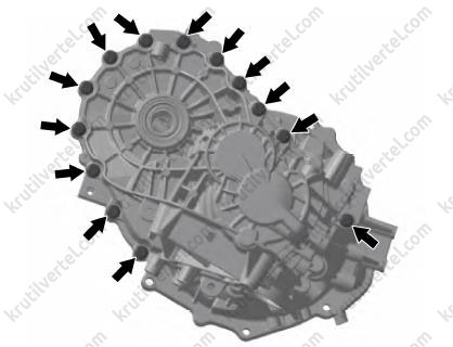 13. Выкрутить 19 болтов крепления корпуса коробки передач, как показано на изображении ниже.