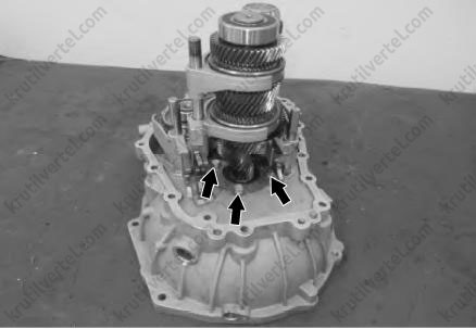 Слегка приподнимите главную передачу/дифференциал и вставьте вышеуказанные детали в картер коробки передач.