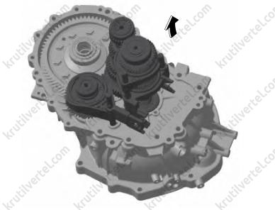 Извлечь вал передачи заднего хода и вилку передачи заднего хода, первичный вал и вилку со штоком в сборе, вторичный вал и вилку 1-Й/2-Й передач. При извлечении детали можно слегка покачивать, при этом главную передачу/дифференциал можно слегка приподнять.