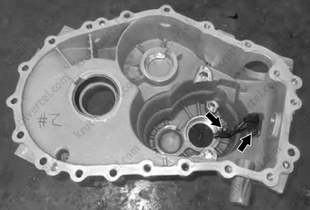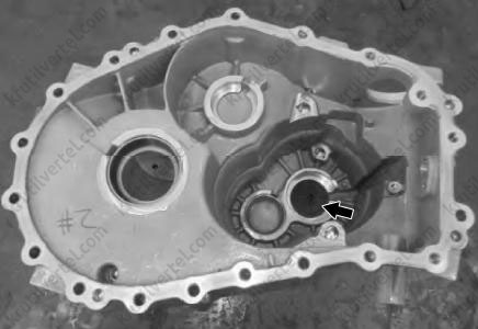 После извлечения вторичного вала, первичного вала, вилки со штоком и вилки включения первой и второй передач извлечь магнит. Магнит расположен рядом с пазом главной передачи/дифференциала и вторичного вала.