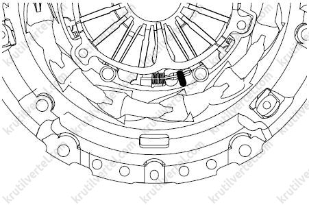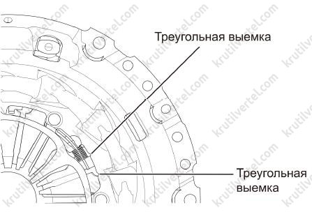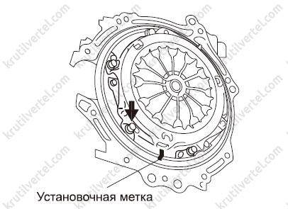 2. Нанести установочную метку на крышку сцепления и маховик, как показано на изображении ниже.