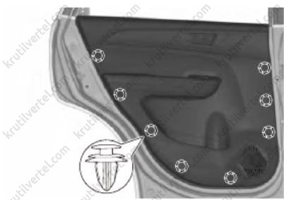 7. Отсоединить 8 фиксаторов крепления панели облицовки двери.