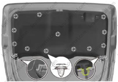 6. Отсоединить 4 фиксатора крепления, 2 зажима, 12 защелок, как показано на изображении ниже.