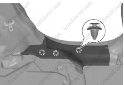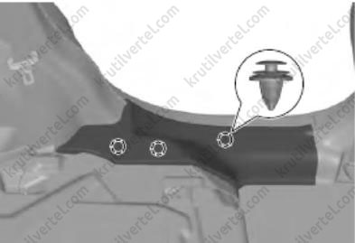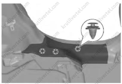 10. Снять 2 фиксатора и 2 зажима и снять нижнюю защитную панель стойки В, как показано на изображении ниже.