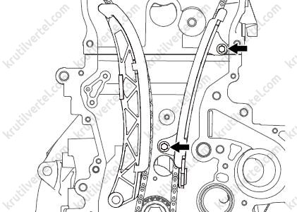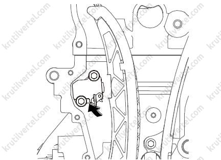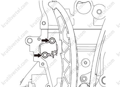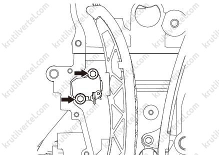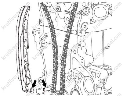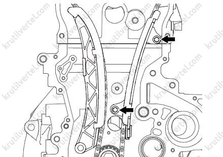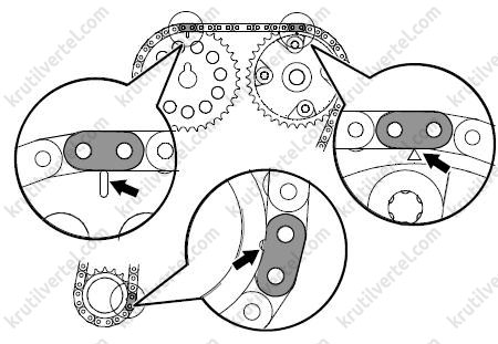 После снятия цепи ни в коем случае не проворачивайте коленчатый и распределительный валы по отдельности. В противном случае поршни и клапаны могут столкнуться, в результате чего может возникнуть повреждение поршней и клапанов.