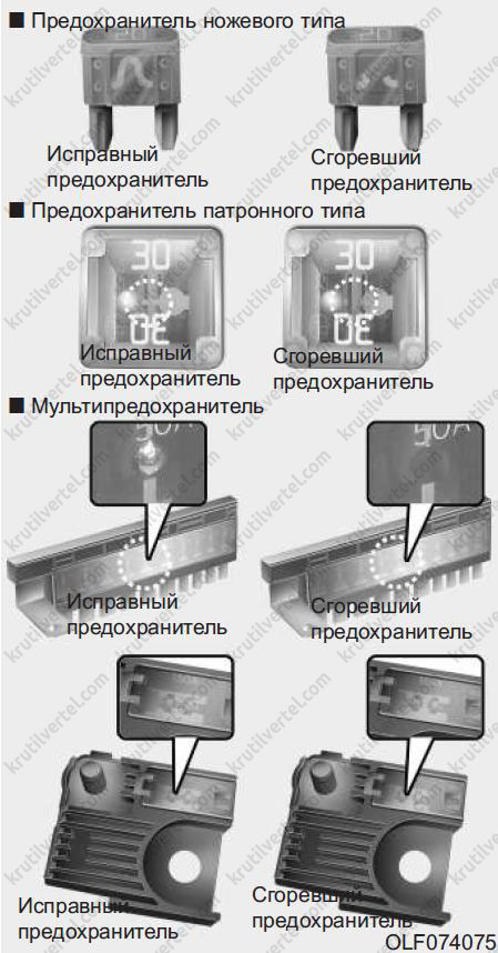 Если не работают какие-либо световые приборы, вспомогательное оборудование или органы управления, проверьте состояние предохранителя соответствующей цепи. На перегорание предохранителя указывает расплавление его внутреннего элемента.